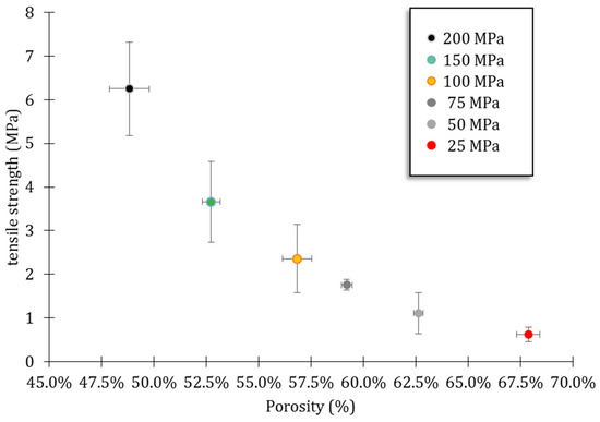 Tensile strength as a function of porosity for different compaction pressures applied.