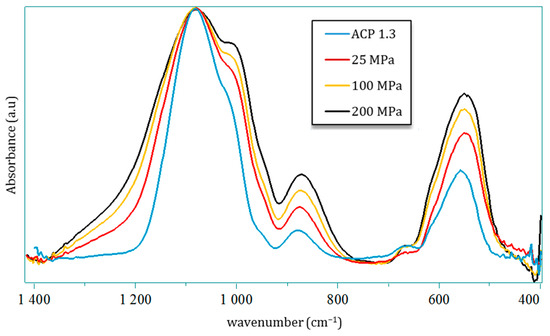 After compression, all samples were found to remain amorphous on XRD, and Figure 3 displays the typical examples of the ACP powder pressed under 100, 150 or 200 MPa in comparison to the starting powder. In all cases, the broad diffraction halo characteristic of amorphous compounds can be observed with no peak sharpening nor shift of the halo maxima. In order to further investigate possible changes undergone by the precursor ACP powder, FTIR analyses (in transmission mode) were run. As pointed out in Figure 7, despite global spectra characteristic of amorphous calcium phosphate, modifications may be identified in the ν3(PO4) and ν4 (PO4) domains. These bands are by definition complex superimpositions of several spectral contributions [23]. Several trends may be drawn on the global shape of the ν3(PO4) band upon varying the mechanical pressure with, on one hand, a broadening effect especially on the high frequency side and, on the other hand, an increase in relative intensities of two sub-components at 1010 and 1080 cm−1. The ν4 domain shows only little modification, except for a more prominent shoulder at 604 cm−1. These findings may probably be related to observations made in the literature on CaP compounds, for which the relative intensity of ν3 and ν4(PO4) sub-components was found to be dependent on compositional/structural features of the samples. For example, in bone/enamel, the intensity of the 1030 cm−1 contribution was shown to be especially prominent for mature samples, while a shoulder at ca. 1110 cm−1 or 1125 cm−1 is more visible for immature samples. A progressive inversion of low wavenumber/high wavenumber relative intensities in the ν3(PO4) domain, close to our findings, has for example been observed by investigating dental enamel from the immature (outer) to mature (inner) tissue [24]. Also, in the follow-up of ACP-to-apatite transformation [25], the increase in a contribution at 999 cm−1 and a decreased intensity at 1055 cm−1 were reported along the progression of the conversion. It may however be noted that such literature reports on amorphous or metastable CaPs were not obtained by application of a mechanical pressure nor through a consolidation process. The only FTIR studies reporting, to our knowledge, the influence of mechanical pressure were carried out on highly crystallized CaP phases [26,27,28,29,30]. Although spectral modifications were seen in these cases in the ν3/ν4(PO4) domains (in terms of relative intensities, position and bands widening), they were found to be reversible upon pressure release, which does not seem to be the case in our present work on ACP. This could tentatively be explained by the lack of long-range order found in ACP or immature/mestastable CaPs like nanocrystalline apatite, compared to highly crystalline phases.