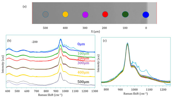 Raman multi-point spectral analyses along the compression axis: (a) location of the spots, (b) corresponding Raman spectra (light colors refer to 100 MPa and dark colors to 200 MPa) and (c) superimposition of all spectra in the 800–1200 cm−1 range.