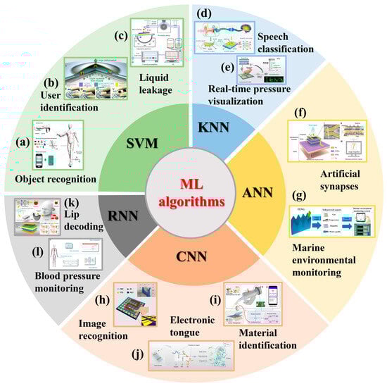 ML algorithm-assisted TENG sensors. (a) TENG sensor for object recognition [67]; (b) TENG sensor for user identification [68]; (c) TENG sensor for liquid leakage monitoring [69]; (d) TENG sensor for speech classification [70]; (e) TENG sensor for real-time pressure visualization [71]; (f) TENG sensor for artificial synapses [72]; (g) TENG sensor for marine environmental monitoring [54]; (h) TENG sensor for image recognition [73]; (i) TENG sensor for material identification [74]; (j) TENG sensor for taste sensing [57]; (k) TENG sensor for lip decoding [75]; (l) TENG sensor for blood pressure monitoring [76].