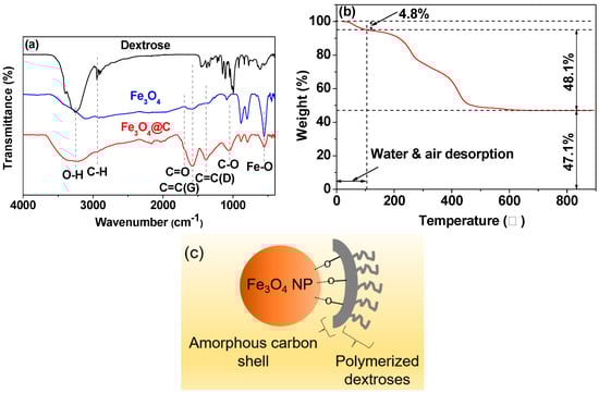 3.1. Particle Diameter and Crystallinity of the Fe3O4@C NPs