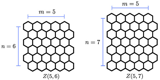 In the current study, we attempt to construct such an energy function, , restricting our attention to a single family of rectangular, hydrogen-terminated graphene flakes: multiple zigzag chains . (See Chapter 9 of [11,12]; for a graphical definition of these structures, see Figure 1). It is straightforward to establish that for a hydrogen-terminated multiple zigzag chain of width m and height n, the number of carbon atoms is equal to , the number of hydrogen atoms is equal to , and the total number N of electrons is equal to . Taking into account that most quantum chemical methods require a diagonalization step [13], which scales according to with the number of electrons (see, for example, p. 191 of [1]), we can estimate that for large m and n, the cost of quantum chemical calculations for is proportional to . It is therefore natural to ask whether the quantum chemical energy of a graphene flake and the corresponding equilibrium molecular geometry can be obtained by some simpler means. In the current paper, we demonstrate that indeed, for multiple zigzag chains , such a shortcut can be designed, and the energy function of fully optimized multiple zigzag chains can be determined without quantum chemical calculations to a surprisingly high level of accuracy. We believe that a similar approach could also be designed for other carbon nanostructures, including graphene flakes [14,15] of other shapes, carbon nanotubes [16], and fullerenes [17,18].