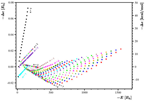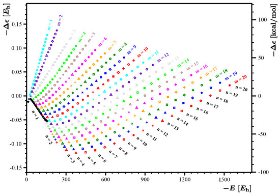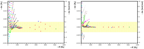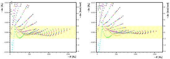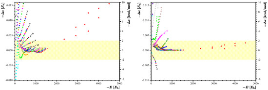 Energy residuals corresponding to the fit obtained with a set . Points depicted in identical colors have identical values of m, and points depicted with identical symbols have identical values of n. For the convenience of the reader, the energy residuum scale is given in hartree (left axis) and in kcal/mol (right axis).