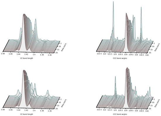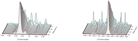 - Small rectangular graphene flakes are known for their various interesting chemical deviations from the typical behavior of polycyclic hydrocarbons, including their open-shell ground state [53,54,55,56] and pronounced radical character [57,58,59,60,61,62,63]. Our work shows that larger flakes are more uniform, suggesting that the transition from finite, pyrene-like, small flakes to infinite, graphene-like, large flakes happens in the regime of . To investigate this issue in more detail, we have analyzed the distribution of the CC bond lengths and CCC bond angles in the transition from small to large flakes. Before discussing the results, let us only briefly comment that in the transition from small to large flakes, one would expect that the bond lengths and bond angles would become more uniform, approaching the values corresponding to an infinite graphene sheet, i.e., CC bond lengths of 1.42–1.43 Å obtained from the DFT calculations [64,65,66,67] and of 1.42 Å obtained from experiment and an angle of corresponding to a hexagonal geometry. The results for square flakes defined by the formula for –20 are presented in Figure 8.