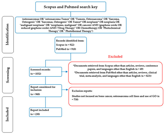 The publications related to the study of GO and rGO and their application to the treatment of bone cancer were obtained using the following search key in Scopus: TS = ((osteosarcomas OR “osteosarcoma Tumor” OR “Tumors, Osteosarcoma” OR “Sarcoma, Osteogenic” OR “Sarcomas, Osteogenic” OR Tumor* OR neoplasm* OR neoplasia OR “malignant neoplasm” OR “neoplasms, malignant” OR cancers) AND (graphene oxide OR reduced graphene oxide) AND (“Drug Therapy” OR Chemotherapy OR “Photochemical Therapy” OR “Photothermal Therapy”)). This search yielded 922 (retrieved from Scopus on 4 June 2023) articles filtered by titles, abstracts, and keywords (Figure 1). With this same search key, 910 articles were retrieved in PubMed, a total result of 1832. Subsequently, the search was refined, limiting the type of document to “article,” “review,” or “conference paper,” and the English language, which allowed the exclusion of 49 documents in Scopus and 823 documents in PubMed, which generated 960 documents. These results removed 730 papers not addressing bone cancer, osteosarcoma cell lines, or use of GO, yielding only 230 articles for this study.