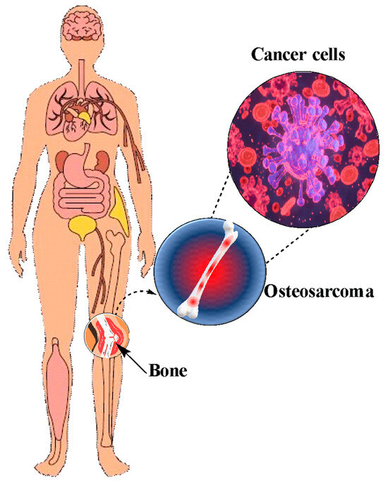 Osteosarcoma diagram in human bones. ©[Barba] via https://www.canva.com/ (accessed on 27 November 2023).