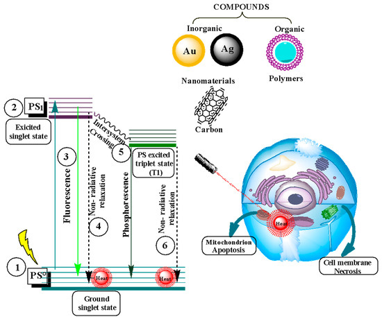 Photothermal therapy (PTT) is based on irradiation using light of a single wavelength in the near-infrared (NIR) range, ranging from 750 to 1000 nm. This light is absorbed by photosensitive agents that convert it into heat, generating a photothermal effect that produces a controlled temperature increase in a localized manner [123,132]. Figure 6 shows a photothermal diagram with a photosensitizer (PS) that is irradiated using a beam of light of a specific wavelength (1), thus generating a state of excitation from PS° to the PS1 state (2). During this base-to-excited level excitation, several processes can occur. The first is radioactive transition, where a photon is emitted as fluorescence (3). Then, non-radioactive relaxation converts the dissipated energy into heat (4) [133]. Finally, a triplet state is generated due to the intersystem crossing (5), where interaction occurs with the oxygen molecules found in the medium (a process used in photodynamic therapy). In turn, these triplet state molecules can undergo non-radioactive relaxation (6) [108].