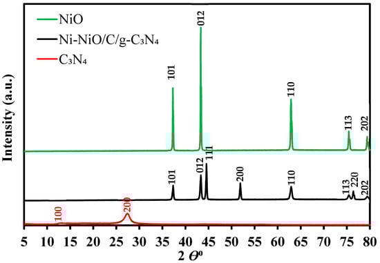 The XRD patterns of the C3N4, NiO, and Ni-NiO/C/g-C3N4 composites are presented in Figure 1. The C3N4 crystal structure shows peaks around 13.04° (100) and 27.55° (200), which are also shown in the literature at almost the same region []. The diffraction peaks of NiO are indexing (PDF 01-089-7390) with representing planes at around 2θ° of 37.24 (101), 43.29 (012), 62.84 (110), 75.414 (113), and 79.384 (202). The diffraction peak of the Ni-NiO/C/g-C3N4 composite catalyst is presented in the XRD pattern at 2θ° with corresponding planes of 37.43, 43.33, 51.7, 63.11, 75.31, and 79.384 (202), and these records are well-matched with the NiO rhombohedral structure (PDF 01-089-7390). Although, new peaks at 2 θ°, 44.49 (111), 52.84 (200), and 76.37 (220) were observed in the XRD spectrum of Ni-NiO/C/g-C3N4, which indicates the presence of Ni (PDF 01-071-3740). Ni may be formed due to the partial reduction of the Ni precursor during the calcination of the tissue paper, which produces CO and CO2 after burning. The presence of CO and CO2 hindered the oxidation of the nickel. Therefore, a mixed phase of Ni-NiO was formed due to less oxygen during calcination []. However, the carbon and g-C3N4 peaks were not observed due to their small amount and low peak intensity compared to NiO in the Ni-NiO/C/g-C3N4 nanohybrid [].
