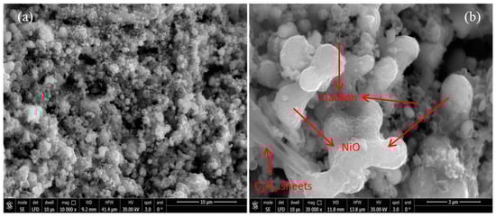 The morphological features and surface texture of the NiO/C/g-C3N4 catalyst were analysed by a scanning electron microscope (SEM) as depicted in Figure 2. The SEM images are shown in Figure 2a showing the fine particle structures. Figure 2b exhibits the spherical shape of the NiO, and some of the irregular, wrinkled sheet-like attachments appear due to the incorporation of carbon and g-C3N4 with NiO. The spherical agglomerate shape from NiO was reported in the previous study [], and the stacked sheet-like morphology was defined for g-C3N4 []. Moreover, the EDX profile of the NiO/C/g-C3N4 composite confirmed the following chemical elements with their atomic percentage states as Ni (49.12%), C (22.26%), O (22.62%), and N (1.01%).