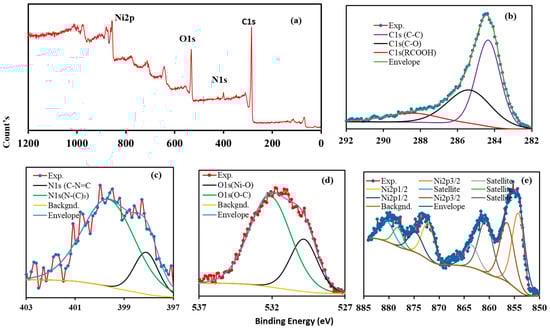 The chemical composition of the NiO/C/g-C3N4 catalyst was recorded using XPS analysis as illustrated in Figure 3. The complete scan survey of the composite catalyst is exhibited in Figure 3a, indicating the presence of C1s (285.42 eV), N1s (399.93 eV), O1s (532.21 eV), and Ni2p3/2 (856.24 eV). Figure 3b represents the wide scan C1s spectra deconvoluted into 284.34, 285.36, and 288.43 (eV), representing the sp2 (C–C bonds), C-O, and sp2-bonded carbon in (RCOOH). These peaks for C1s agree with the reported literature []. Figure 3c shows two spectra for N1s deconvoluted into 393.1.88 and 399.64 eV. The O1s spectra in Figure 3d with one high-intensity bump at around 529.83 eV and low-intensity peak at 532.13 eV confirm the N-O bond and O2- oxidation state, respectively []. Figure 3e exhibits several peaks with corresponding binding energy at 854.03, 863.63, and 872.18, belonging to the Ni2p3/2, while the other peaks appearing at 880.48, 878.21, 874.7, 856.01, and 860.76 eV represent the Ni2p1/2 and satellite peaks. However, the XPS peak for metallic Ni generally appeared around 852.6 eV and was not observed in the deconvoluted spectra of Ni2p3. Generally, metallic Ni in the NiO lattice structure and XPS scan the surface of the materials, which typically do not appear in the XPS spectrum. Similar results were also reported in previously reported articles [,]. The recorded chemical elements of C1s, O1s, N1s, and Ni2p3/2 in the composite catalyst with their peaks, spectra, and binding energy confirm the successful formation of the NiO/C/g-C3N4 hybrid catalyst.