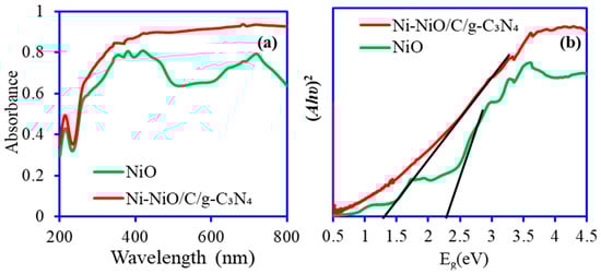 The light absorption properties and band gap analysis of NiO and the Ni-NiO/C/g-C3N4 nanohybrid are depicted in Figure 4. The UV-visible spectra of NiO and Ni-NiO/C/g-C3N4 are depicted in Figure 4a. Figure 4a displays an absorption edge around 224 nm, which is attributed to the electronic transitions from the ionized oxygen vacancies (IOV) to the valence band (VB) of the NiO. These transitions may arise due to existing defects in NiO nanostructures []. The band gap energy (Eg) of the NiO and Ni-NiO/C/g-C3N4 nanohybrid was calculated using the equation (Ahυ)n = B(hυ − Eg) (where: hυ—photo energy; A—absorbance; B—material constant; and n is 2 or 1/2 for direct and indirect transitions). Figure 4b illustrates the band gap for pure NiO and Ni-NiO/C/g-C3N4 as 2.36 eV and 1.45 eV, respectively. NiO band gap energy is generally above 3.2, but thermally synthesized NiO materials show a lower Eg 2.83 eV []. Moreover, Hosny [] reported that the different precursors also have a role in directing the Eg of the NiO and observed NiO nanoparticles’ Eg: 3.12, 2.93, 2.82, and 2.45 eV using different precursors calcinated at 700 °C. The optical analysis revealed that NiO and Ni-NiO/C/g-C3N4 are capable of absorbing visible light.