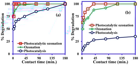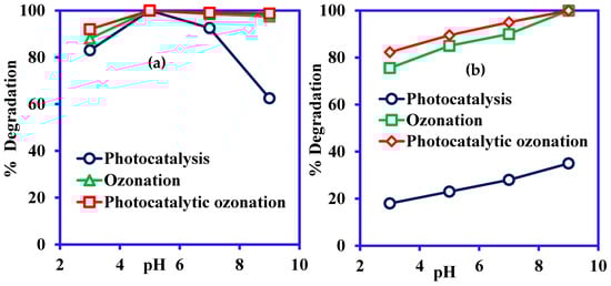 The integrated PC/O3 process showed that the degradation of the CR and ARS increases with the rise in solution pH. The integrated PC/O3 process produces higher •OH than photocatalysis or ozonation, which showed the enhanced decomposition of the CR and ARS molecules. Moreover, higher •OH radicals are produced in the basic medium due to the −OH ions. Therefore, a better decomposition of the dye molecules was observed in the basic medium [].