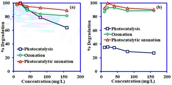 The effect of the initial concentrations of CR and ARS was investigated from 10 mg/L to 160 mg/L at optimized pH 5.0 for CR and 9.0 for ARS and the results are illustrated in Figure 8. The percentage of the degradation of CR and ARS initially at low concentrations was high for both dyes. When the initial concentrations of the dyes were increased, the degradation performance was also slower than at low concentrations, and 20 mg/L of both dye concentrations reached optimum degradation in all three degradation methods. The photocatalytic activity by the Ni-NiO/C/g-C3N4 composite was comparatively weakened at higher dye concentrations due to an increase in the viscosity and subsequent decline of optical density, which hindered the penetration of the photons into the sample and consequently gradually declined the photoexcitation of electrons []. On the other hand, in the ozonation process, the percentages of CR and ARS degradations initially were also high, and while increasing the initial concentrations, CR and ARS subsequently molecules increased in the solution, but the competition of •OH radicals and the shortage of •OH production from O3 depletion was influenced the CR and ARS degradation capacity. The same behaviour was also reported in a previous study [].