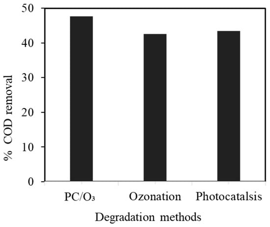 The results in Figure 9 show that the best efficiency was in the integrated PC/O3 process, followed by ozonation and photocatalytic degradation at 47.61%, 42.59%, and 34.4%. This may be due to the synergistic effect of highly oxidative photoelectrons by ozonation, producing a high rate of •OH radicals and triggering the semiconducting modified Ni-NiO/C/g-C3N4 composite for the effective mineralization of organic pollutants.