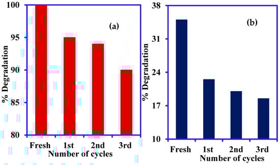 The degradation mechanisms of CR and ARS using Ni-NiO/C/g-C3N4 were mainly proposed by two pathways, including reduction and oxidation processes, as shown in Figure 11a. The photo-generated electron/hole pairs are produced by the Ni-NiO/C/g-C3N4 catalyst under visible light illumination. Upon energy absorption, the semiconductor catalyst’s valence band (VB) electrons were stimulated to the conduction band (CB), leaving a positively charged hole at the VB. The electron–hole pair arises as a result of this []. Superoxide radicals (•O2−) are free radicals created when the significant reduction potential of the electron in the CB reduces O2 in a solution. Due to their high oxidizing potential, the holes left in the VB might oxidize the H2O molecules and create •OH []. The CR and ARS molecules were broken down into CO2 and H2O molecules by the free radicals that were produced []. The possible separation of photo-induced electron–hole pairs in the Ni-NiO/C/g-C3N4 catalyst and the decomposition of the dye moles are demonstrated in Figure 11a.