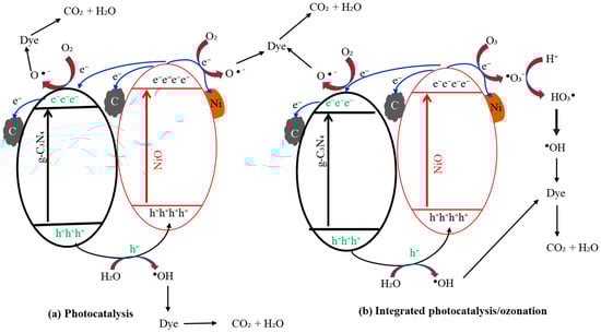 The mechanisms were proposed in the integrated PC/O3 process for the enhanced degradation of CR and ARS. Since the redox potential of oxygen and oxygen peroxide in the reaction medium is higher than the CB potential of the Ni-NiO/C/g-C3N4, electrons move to the oxygen in the reaction medium. They are abundantly transformed into oxygen []. The use of photo-generated carriers and the formation of reactive oxygen species (ROS) will impact the photocatalytic system []. When injected into photocatalytic systems, electrophilic ozone readily captures photo-generated electrons in contrast to its direct ozonation []. The electron–hole pairs are effectively separated under simulated light irradiation, resulting in the efficient transfer of the photo-generated electrons of Ni-NiO/C/g-C3N4, which causes a significant amount of ROS to be formed []. The ozone consumption ratio of the O3/light system can also be increased using a Ni-NiO/C/g-C3N4 catalyst. Abundant ozone molecules increased the reaction’s production of ROS, which helped the mineralization of CR and ARS in an integrated system. A detailed mechanism for the decomposition of dye molecules under an integrated PC/O3 process is shown in Figure 11b.