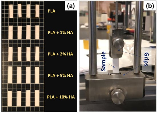 Mechanical characterization of PLA and PLA/HA nanocomposite materials was performed through tensile tests using a Microtest universal testing machine employing SCM3000 software. The polymer samples were prepared by cutting four rectangular specimens of dimensions 30–40 mm × 7–9 mm from each type of material (Figure 1). Average values of the length, width, and thickness, respectively, were obtained for each sample. For each specimen, the thickness was obtained from the average of three measurements taken at three different points on the specimen using a caliper. Also, the specimens were weighted to calculate their apparent densities, which were compared with the bulk densities of the materials. For each sample, the densities of the bulk materials were calculated using the rule of mixtures [,].