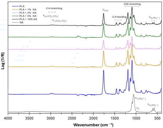 In Figure 2, the ATR-FTIR spectra of the PLA/HA samples are shown. The spectra showed the absorption bands characteristic of both polylactic acid and hydroxyapatite. Specifically, in PLA, several key vibrational bands were identified, providing important information about its composition and structural characteristics. The region between 3000–2850 cm−1 shows C-H stretching bands, indicative of stretching vibrations associated with CH and CH3 groups that are present in the polymer’s backbone. A strong absorption band is observed in the vicinity of 1750–1755 cm−1, corresponding to the carbonyl group (C=O). The bands within the range of 1450–1380 cm−1 correspond to C-H bending vibrations, whereas ester groups reveal themselves through C-O stretching vibrations, detectable at 1180–1280 cm−1. The spectra also encompass bands in 1300–1000 cm−1, reflecting stretching vibrations linked to the C-C and C-O-C bonds within the polymer chain [,]. The main characteristic bands from HA were also present in the spectra [,,]. According to the literature [], in the 1200–500 cm−1 range, characteristic PO43− vibrations were expected, specifically, at ν1~960 cm−1 symmetric stretching mode of the PO4 tetrahedron [,], a strong doublet between 1091–1039 cm−1 usually is present and assigned to the asymmetric stretching (ν3) of the PO43− [] while the bands at 570 cm−1 and 601 cm−1 corresponds to asymmetric bending modes [] were detectable for the samples with higher particle content, given that the bands between 1000–1200 cm−1 overlapped with those from stretching vibrations of C-O-C bonds of the ester group and the rocking bands of the alkyl groups.