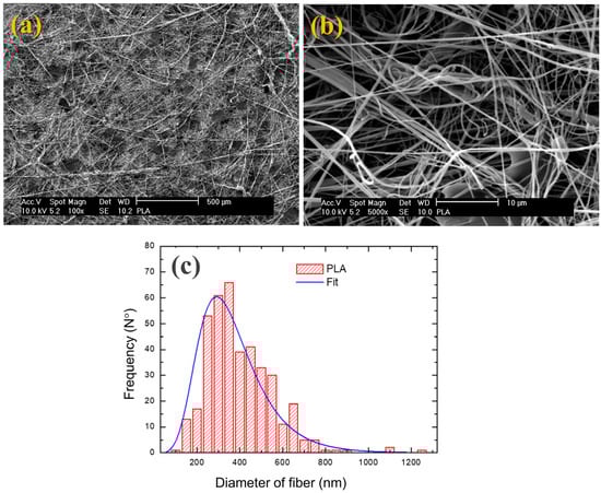 SEM images for pure polylactic acid (PLA) sample at (a) 100× and (b) 5000× magnifications. (c) Fiber diameter distribution for PLA.
