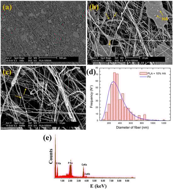 A similar fibrillar morphology was observed for PLA filled with HA NPs. Figure 4 shows the SEM micrographs for PLA filled with 10% HA NPs. In particular, Figure 4a–c shows the morphologies observed at 100×, 2000× and 5000×, respectively. As shown in Figure 4a, platelet-like regions were observed distributed throughout the sample, which was attributed to a more abrupt ejection of the solution and the subsequent spreading of the sample due to air pressure. At 5000× (Figure 4c), only a characteristic region with fibrillar morphology of the PLA + 10% HA sample is shown. In Figure 4b,c, the arrows point out bright domains on the image, which are associated with the presence of HA particles, as was confirmed by energy-dispersive X-ray spectroscopy analysis. Given the particle content of this sample (10% HA NPs), in Figure 4b, there are bright spots showing domains of different sizes, indicating that for higher particle content, small aggregates of HA nanoparticles are formed. Nonetheless, the distribution of HA remains homogeneous throughout the sample. Figure 4d shows the distribution of the fiber diameters for the PLA + 10% HA sample, which exhibited a mean value of 357 ± 160 nm. Similar morphologies were observed for the rest of the samples under study (see Figure S1). In Figure 4e, a representative EDS microanalysis is shown, which corresponds to the HA-rich domains. The presence of calcium (Ca) and phosphorous (P) indicates the presence of HA.