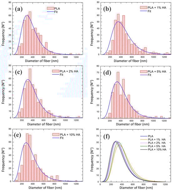 Fiber diameter and fiber diameter distributions of observed fiber diameters for (a) polylactic acid (PLA), (b) PLA + 1% HA, (c) PLA + 2% HA, (d) PLA + 5% HA, and (e) PLA + 10% HA and (f) fiber diameter distributions for the different polylactic acid (PLA) and PLA/hydroxyapatite (HA) nanocomposites.
