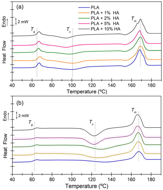 Differential scanning calorimetry thermograms of polylactic acid (PLA) and PLA/hydroxyapatite (HA) nanocomposites during (a) first and (b) second heating scan.
