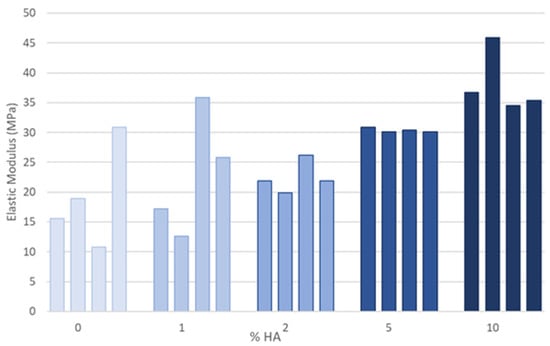 Figure 7 shows the elastic modulus of each specimen tested in this study. The elastic modulus was obtained from the first linear part of the stress–strain plots. The orders of magnitude of the elastic moduli were like those observed in electrospun fibrous PLA materials. For example, Tjong et al. reported an elastic modulus of approximately 8.5 MPa for electrospun PLA and 10 MPa for electrospun PLA loaded with 15% nano-HA []. In this study, the elastic modulus for PLA + 10% HA was found to be 38.1 ± 5.3 MPa.