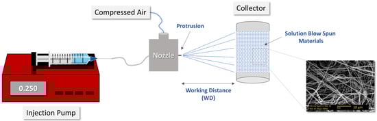 - Gonzalez-Benito, J.; Teno, J.; Torres, D.; Díaz, M. Solution Blow Spinning and Obtaining Submicrometric Fibers of Different Polymers. Int. J. Nanoparticles Nanotechnol. 2017, 3, 007. [Google Scholar]