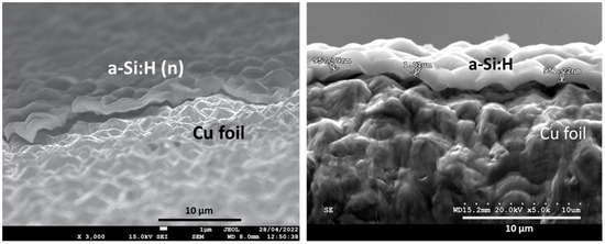 Cross section of FESEM images of a-Si:H thin films deposited on the rough side of Cu foils. The aSi:H thickness was approximately 1 µm.