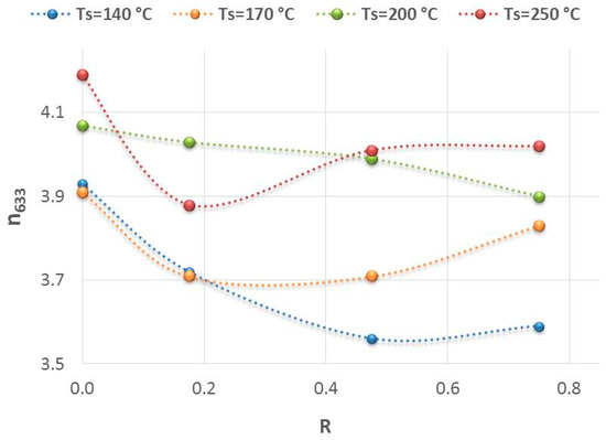 Evolution of the refractive index at 633 nm, as a function of the ratio R for the range of substrate temperatures studied.