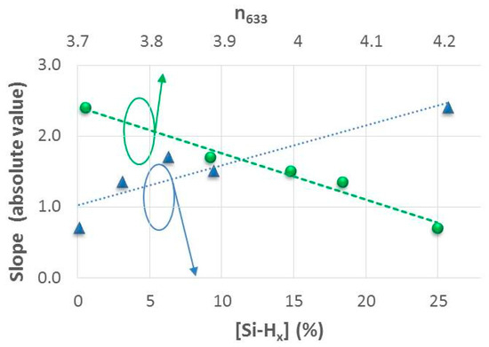 Slope absolute values of the lineal fits versus polyhydride concentration and refractive index (at 633 nm) for the LIBs previously represented in Figure 8. The dashed lines are a guide for the eyes.