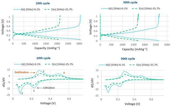 In order to compare the electrochemical results of batteries with a similar active mass and a different polyhydride concentration [Si-Hx] in their electrodes, the galvanostatic charge–discharge curves (GCD), together with the resulting differential capacitance (dQ/dV) curves extracted from these GCD profiles for the 5th and the 50th cycles, are presented in Figure 10. The full range of [Si-Hx] percentages is covered with data for batteries A and E, with [Si-Hx] of 0.1% and 25.7%, respectively.