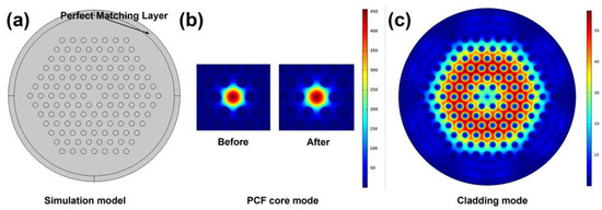 (a) The simulation model of PCF; (b) the simulation core modes of PCF before and after being filled with magnetic fluid; (c) the simulation cladding mode of the PCF after being filled with magnetic fluid.
