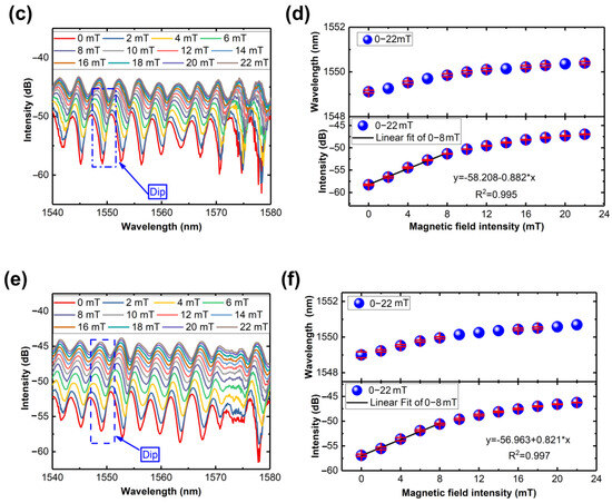 To assess the performance of the fiber-optic magnetometer, three sensors were fabricated using PCFs with lengths of about 5.5 cm, 9.5 cm, and 9.5 cm, respectively. In the measurement, the magnetometer was positioned at the center of the magnetic field generator, aligned parallel to the external magnetic field, as depicted in Figure 4b. The magnetic field was incrementally raised from 0 mT to 22 mT in intervals of 2 mT. At each measurement point, the transmission spectrum was recorded by OSA and analyzed using the computer. The corresponding response at different magnetic field intensities is illustrated in Figure 5a,c,d. With the magnetic field intensity increasing, the intensity of the transmission spectrum dips gradually increased while the wavelength slightly moved to a longer wavelength. The reduction in spectral transmission loss is due to the magnetic field altering the optical properties of the magnetic fluid [26], i.e., the changes in absorption, scattering coefficients, refractive index, etc. The light intensity can also be written as follows: