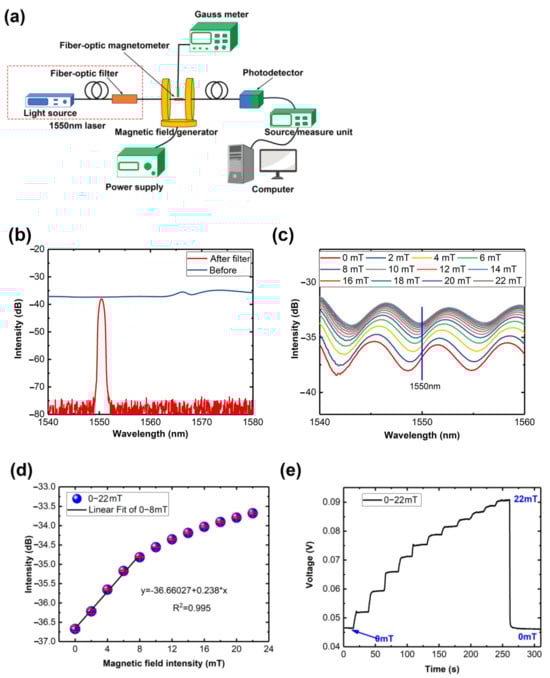 The performance comparison of our fiber-optic magnetometer with others is listed in Table 1. Due to the intensity demodulation used, it can be more easily converted into electrical signals compared to other magnetometers based on wavelength demodulation [27,28], thus facilitating cost reduction and miniaturization. In contrast to other intensity-demodulated fiber-optic magnetometers, the proposed fiber-optic magnetometer still presents a good sensitivity in a single wavelength of 1550.03 nm, and the conversion of light signals into electrical signals is realized.