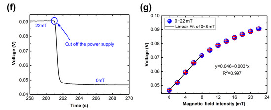 As shown in Figure 5a,c,e, the spectrum intensity of the 5.5 cm PCF fiber-optic magnetometer consistently increases near 1550 nm. Then, data near 1550 nm of the 5.5 cm PCF fiber-optic magnetometer were extracted from Figure 5a and depicted in Figure 6c, revealing a sensitivity of 0.238 dB/mT (Figure 6d) with a maximum error of 0.06156 in the region of 0–8 mT at 1550.03 nm. Similar to the previous experiment, the magnetic field intensity gradually increased up to 22 mT. The entire process is depicted in Figure 6e. The output voltage is increasing corresponding to the external magnetic field, which corresponds to the increased light intensity near the wavelength of 1550 nm. Additionally, Figure 6f illustrates the recovery time span from 22 mT to 0 mT, which lasts approximately 1 s for the entire span. Within the magnetic field range of 0–8 mT, as shown in Figure 6g, the fiber-optic magnetometer exhibits a sensitivity of 0.003 V/mT, with a maximum standard error of 5.56776 × 10−4. The reason that the slope of electrical sensitivity is not consistent with the light intensity signal at 1550.03 nm may be due to the broader bandwidth of the fiber-optic filter.