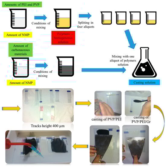 Subsequently, 0.1 g of polyvinylpyrrolidone (PVP) was added to the PEI/carbon dispersion and stirred gently for 1 h until a homogeneous suspension was obtained. The resulting suspension was degassed by ultrasonication to remove trapped air bubbles. A homogeneous casting suspension was poured onto a glass plate (bringing the thickness to 400 microns) and immersed in a coagulation bath containing water as a non-solvent. The resulting membrane was kept in a coagulation bath for 24 h to ensure complete phase inversion.
