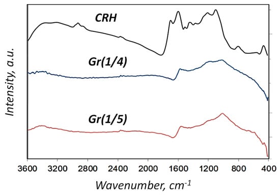Carbonation at 1123 K, in combination with chemical activation, showed an increase in carbon content (from ~55 wt.% CRH to ~75 wt.% in Gr(1/4)) and a decrease in hydrogen content (Figure 2). From 25 wt.% to 40 wt.%, there were various substances, such as silicon, potassium, sodium, iron, and others. Therefore, it was necessary to carry out the separation process after chemical activation. This feature was also revealed using infrared spectroscopy (Figure 3). The infrared spectrum of CRH was characterized by different signals attributed to different functional groups: at about 3000 cm−1, low-intensity bands were due to stretching vibrations of aliphatic and aromatic C-H bonds, while in the mid-frequency range (1700 and 1000 cm−1), a wide combination of peaks was generated based on the overlap of adsorption bands of the carbon skeleton (C=O, C=C, C-C, C-H-C-O stretching and bending modes) [,,]. The Gr(1/4) and Gr(1/5) spectra were characterized by a typical broad shape of large condensed networks of aromatic carbon. Only peaks due to C=C stretching modes and overlapping peaks between 900 and 1600 cm−1 due to frame vibrations were detected. The direct current conductivity (σ) of dispersions of solid samples prepared for measurements by IR spectroscopy (0.5–0.8 wt.% in KBr) was: σCRH = 14 ± 3 nS/m, σGr(1/4) = 80 ± 10 nS/m, and σGr(1/5) = 60 ± 10 nS/m. The DC conductivity trend confirmed that a longer conductive portion was established in the samples.