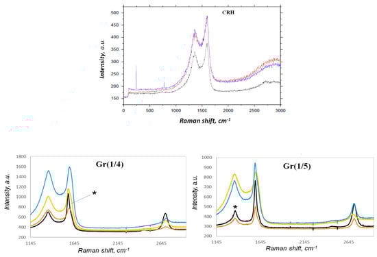 CRH exhibited Raman features associated only with amorphous carbon (D and G bands), with no trace of the G’ band, namely the band (also called 2D) around 2700 cm−1 typical of non-amorphous sp2 carbon structures (Figure 5). The Raman spectra of Gr(1/5) and Gr(1/4) in Figure 5 clearly indicate a mixture of amorphous and graphene components. Significant spatial heterogeneity was detected. The figure shows analysis results from different spatial points. However, two main components could be identified: amorphous carbon (with detectable D and G bands around 1352 and 1594 cm−1) and graphene (with detectable D, G, and G’ bands).