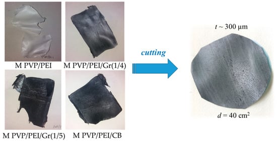 Polyethylenimine- (PEI) (mw ~25,000, Sigma Aldrich from Group of companies “ALTEY”, LLP “Laborpharma” (st. Amangeldy 52, Almaty, Kazakhstan)) or polyvinylpyrrolidone (PVP) (mw ~360,000, Sigma Aldrich from Group of companies “ALTEY”, LLP “Laborpharma” (st. Amangeldy 52, Almaty, Kazakhstan))-modified carbon nanomaterials were prepared by non-immersion precipitation system (NIPS technology) (Figure 1) []. Carbon black (CB) was used as a carbon model for comparison. First, 0.41 g of PEI and 1.95 mL of N-methyl-2-pyrrolidone (NMP) were added to a heat-resistant glass beaker and heated at about 50 °C by stirring for 18 h to obtain a homogeneous polymer suspension. Then, 0.1 g of the graphene sample was dispersed in a small amount of NMP (1 mL) and sonicated for 30 min to obtain a homogeneous dispersion and added to the PEI suspension.
