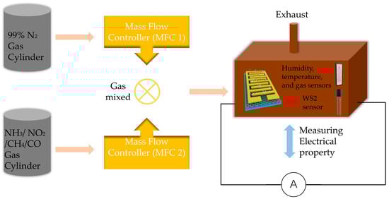 The experimental setup is shown in Figure 3. The monolayer and multilayer WS2 gas sensors were tested with different gases at room temperature and 50 °C. The mass flow controller 1 (MFC 1) controlled the flow rate of nitrogen, while MFC 2 controlled the flow rate of target gases (NH3, NO2, CH4, and CO). The mixed gas (diluting gas from MFC1 and target gas from MFC 2) was induced to the analytical chamber. In this work, we tested our samples with 100 ppm NH3, 500 ppm CH4, 500 ppm CO, and 1 ppm NO2. We also put temperature sensor, humidity sensor, and commercial gas sensors (electrochemical gas sensors from Dfrobot) inside the analytical chamber. The model of temperature sensor and humidity sensor is DHT 11. The relative humidity during the test was around 50–55%. The gas sensors were used for monitoring the gas concentration inside the analytical chamber when performing the tests. The electrical properties of the gas sensors were measured during the gas sensing test.