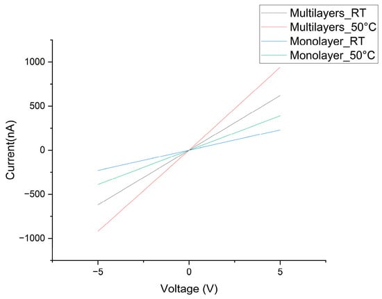 Before conducting the gas sensing performance measurements, the electrical properties of the monolayer WS2 and multilayer WS2 samples were characterized at room temperature and 50 °C as shown in Figure 4. Multilayer WS2 has stronger conductance, and high temperature improves this property. All the curves reveal a linear relation between the measured current and the applied voltage, which ranges from −5 to +5 V.