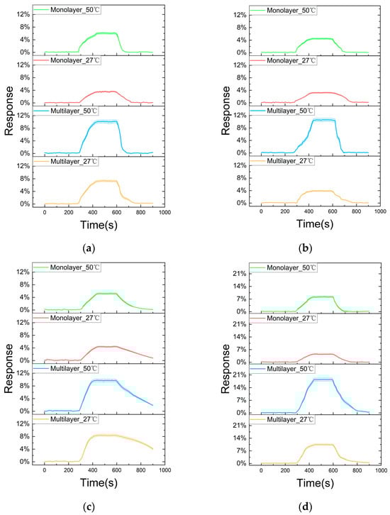 The monolayer and multilayer WS2 sensors were tested with different gases at room temperature (27 °C) and 50 °C. The analyte gas was injected into the chamber at 300 s and stopped at 600 s. Then, the samples were allowed to recover in pure nitrogen gas. The whole experiment lasted 900 s. We repeated the experiments four times and collected the average response data and measurement deviation, as shown in Figure 5.