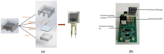 The circuit was built based on the above schematic. The WS2 gas sensor was packaged with polydimethylsiloxane (PDMS) and transparent acrylic as shown in Figure 8a. Figure 8b illustrates the gas sensing circuit including all the electronic components.