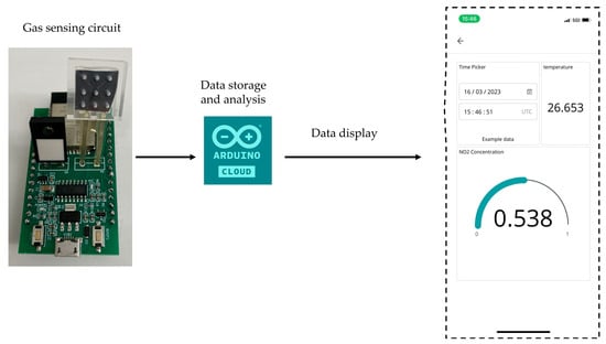 It is necessary to view the data stored on the cloud server so that users may monitor the presence and concentration of the gases and receive alerts. Thus, the sensing data were sent to Arduino IoT cloud for data storage and analysis. Then, we could access the data via phone. We designed a GUI to help people track changes in the concentration of NO2 gas easily. The information of concentration, time, and temperature can be accessed via phone as shown in Figure 9. The system may be utilized almost anywhere because it is lightweight and portable. To test the stability of this system, we tested this gas monitoring system with low concentrations of NO2 after several months and achieved the same performance.
