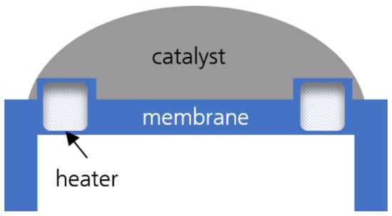 Porous catalyst layers are commonly prepared by dropping ink onto the microheater [] or by using a dispensing technique [,,]. In the present work, the catalyst was deposited on the MEMS sensor substrate by dropping the catalyst ink using a pipette, which is a simplified kind of dispensing technique used to rapidly prepare catalytic layers. However, there is some variation in the coated area of individual sensors as the deposition was performed manually.