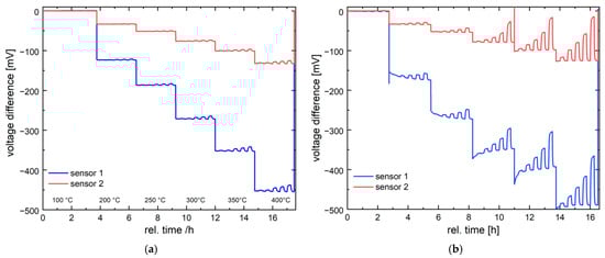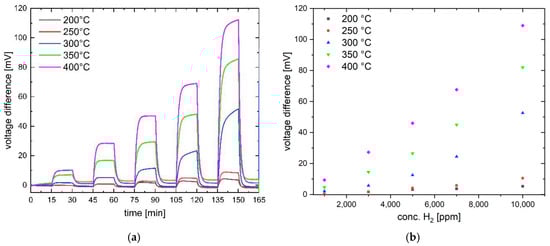 Figure 6 shows the signal from gas sensor 2 at different hydrogen concentrations as a function of the operating temperature. Sensor 1 has a higher sensitivity. After hydrogen exposure (Figure 6a), the signal recovers to the baseline, indicating the reversibility of the catalytic process. However, the sensor does not yet show perfect linearity of the concentration-dependent reaction, especially at higher hydrogen concentrations. The deviation from linearity is due to the. measurement method used, where sensors were operated with the current source without temperature compensation. In this case, the temperature at the catalyst surface at high hydrogen concentrations is higher than the specified operating temperature, which in turn leads to a nonlinear increase in the reaction heat due to a reaction acceleration. To avoid this effect, the Wheatstone bridge must be operated with a voltage source instead of a current source.