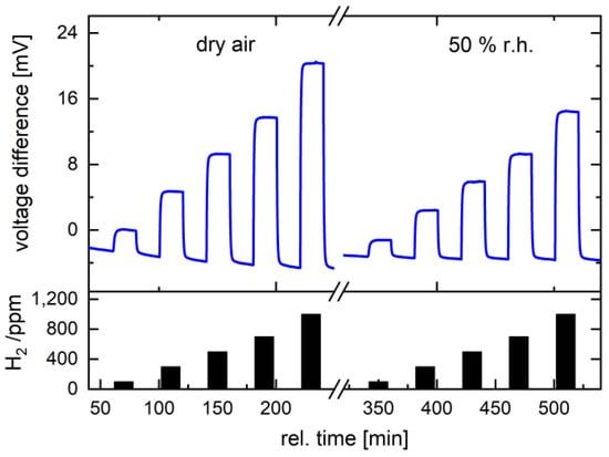 Progressive climate change and the limited resources of fossil fuels make the transition to alternative fuels without carbon content necessary. Hydrogen (H2) is considered one of the most promising energy carriers [,]. However, the handling of hydrogen is potentially more dangerous than the use of hydrocarbons. The minimum ignition energy for hydrogen (0.017 mJ) is ten times lower than that for methane (0.23 mJ) [,], which is why hydrogen has the highest rating of 4 on the flammability scale. Hydrogen forms flammable mixtures with atmospheric oxygen at concentrations between 4%, the so-called lower flammability limit (LFL), and 75%, the so-called upper flammability limit (UFL). The explosion range is between 18% and 59% hydrogen in an oxygen-containing atmosphere []. Therefore, fast and reliable measurement of hydrogen, especially at concentrations below the LFL, is crucial to monitor the formation of potentially explosive mixtures in the air and prevent the risk of fire and hydrogen explosions. In gas sensors for safety applications, alarms are typically set at 20% and 40% of the LFL []. The detection of hydrogen concentrations down to 1000 ppm is therefore desirable for proper sensor function [].