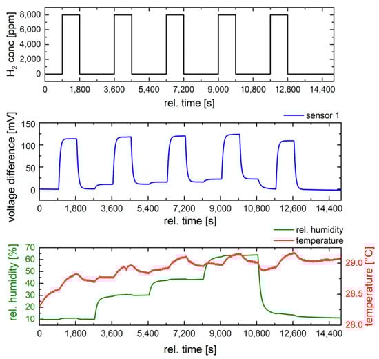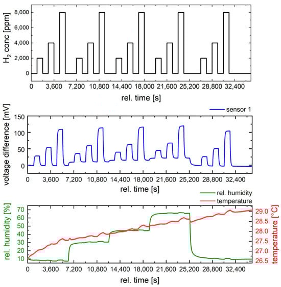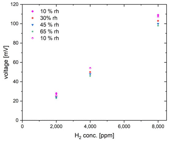 Next, the influence of humidity on the sensor response was investigated at 400 °C for three hydrogen concentrations (2000 ppm, 4000 ppm, and 8000 ppm) (Figure 8). For our investigations, a moderate operation temperature of 400 °C was chosen to reduce the susceptibility of the sensor to humidity and to limit power consumption. The humidity level was varied from 10% RH to 65% RH, while the ambient temperature in the chamber was controlled during measurements.