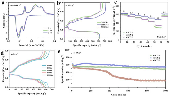 (a) The cyclic voltammetry (CV) curves of MSCN-2 during the initial three cycles. (b) Initial GCD curves at 0.1 A g−1 of the MSCN-x (x = 1, 2, 3). (c) Rate capability. (d) MSCN-2 GCD curves of different cycles. (e) Long-term cycling performance at 2 A g−1.